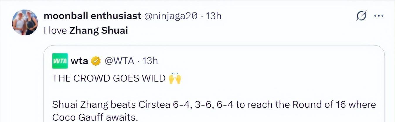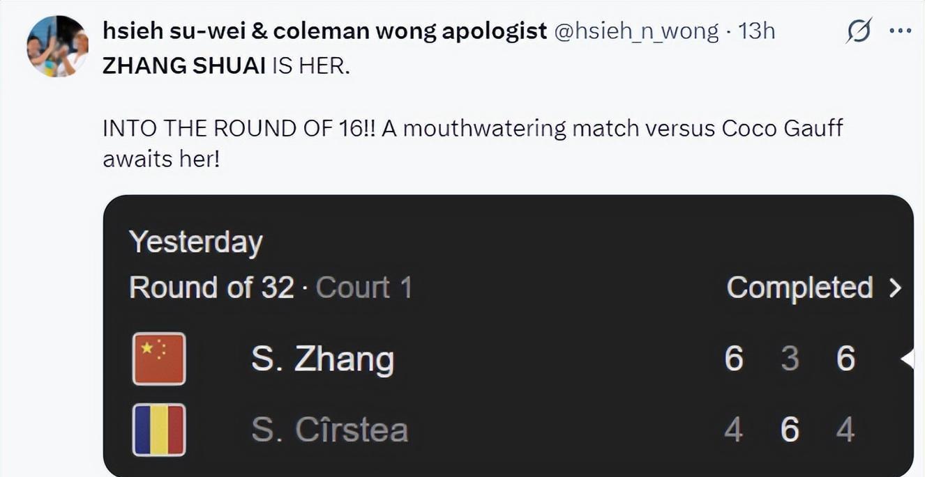 美国球迷:张帅就是她!晋级16强了,下一场她要打三号种子高芙。