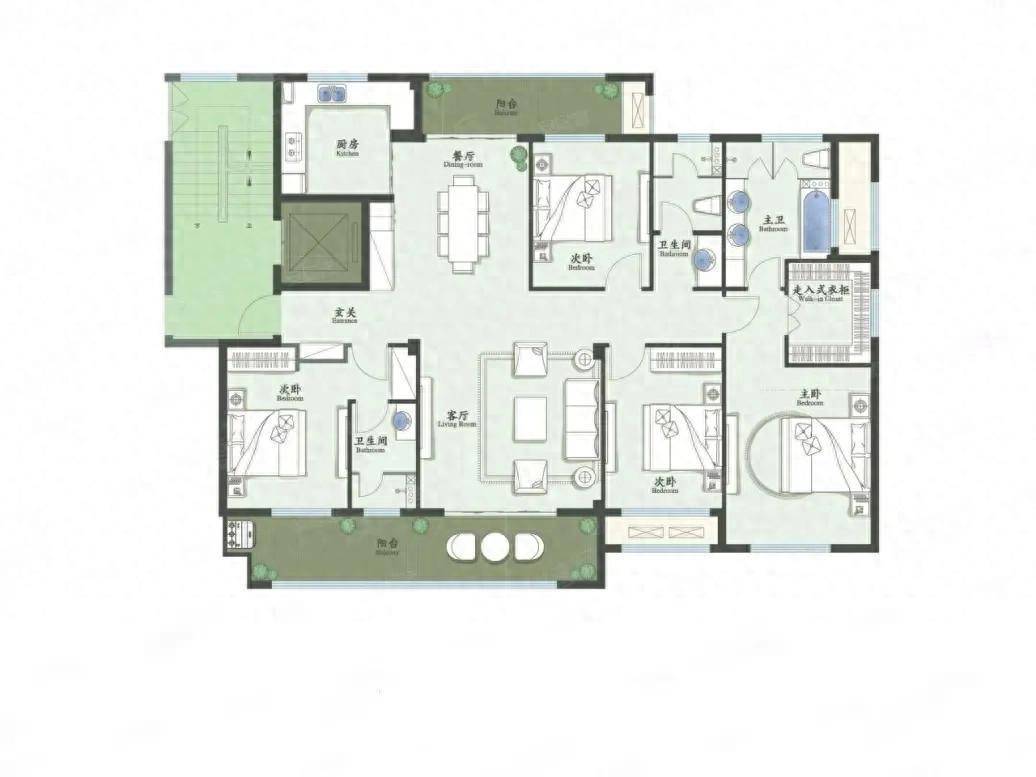 室内配置精准满足居住需求:三个卫生间能够有效缓解多成员家庭的使用压力,在早高峰时段无需争抢,尤其适合三代同堂或二孩家庭;四个卧室的“极致设计”,可以灵活划分为主卧、儿童房、老人房及书房(或客房),满足不同阶段的居住需求,空间规划合理,没有明显的冗余。